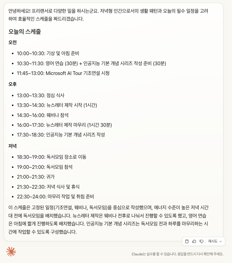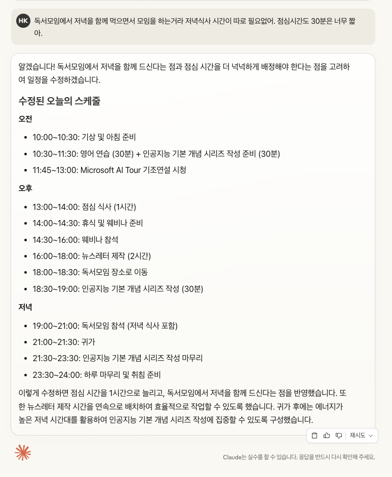 클로드의 답변은 이렇게 받았습니다. 저녁 시간이 따로 필요없고 점심 시간도 좀 늘려달라고 하니 좀 더 널널하게 일정을 짜주었습니다.